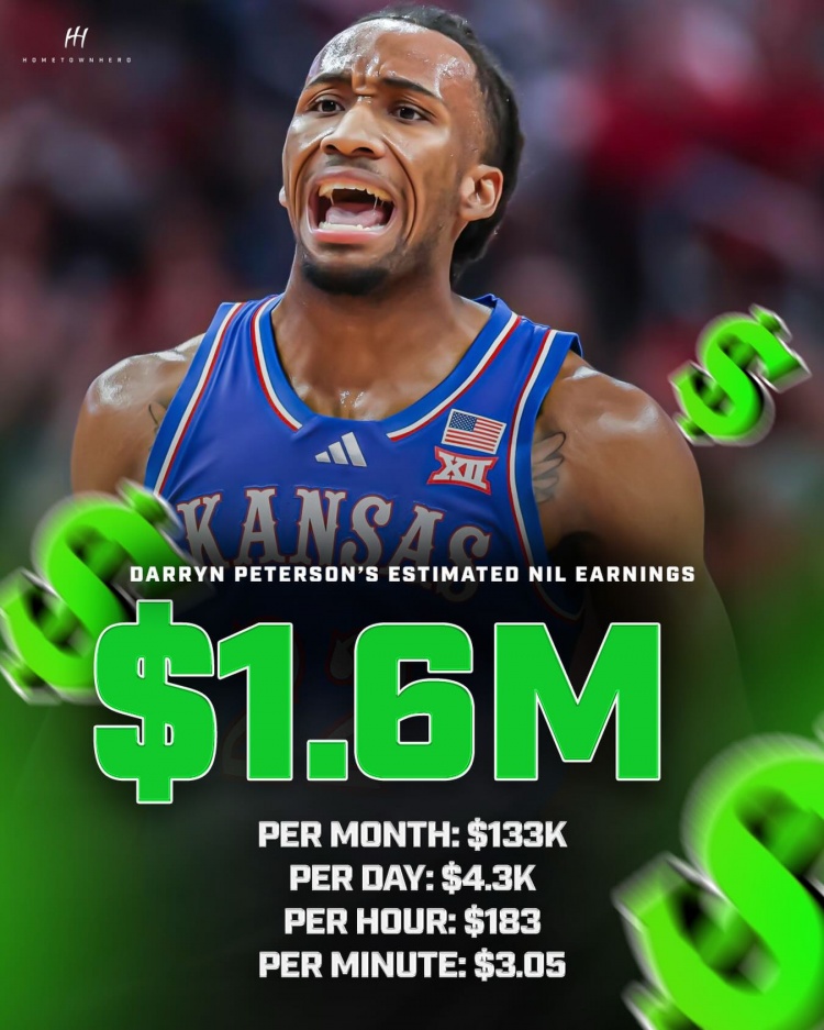 NIL机构Hometown Hero Agency晒出了达林·彼得森的NIL估值,他们还写道:“每一分钱都赚得名副其实,彼得森的NIL估值高达160万美元,而且他非常有可能成为2026年NBA选秀的状元。”