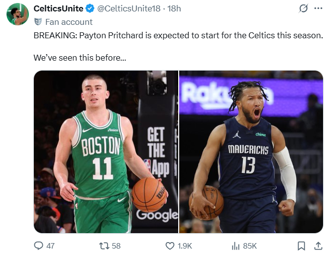 此消息一出,瞬间引起各方热议。凯尔特人非官方球迷账号CelticsUnite发文表示,这个剧本我们熟!并附上了一张布伦森当年在独行侠时的照片,意思指普里查德有望一步一步朝着布伦森的方向发展。