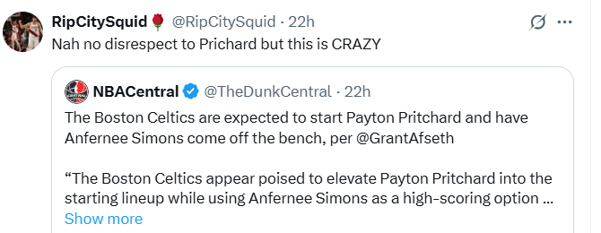 另一方面,开拓者球迷非官方账号RipCitySquid却发文表示,真不是不尊重普里查德,但这一切真的太疯狂了,意思是为自己的旧将安芬尼·西蒙斯鸣不平,毕竟实力不俗的西蒙斯下赛季要给普里查德打替补。