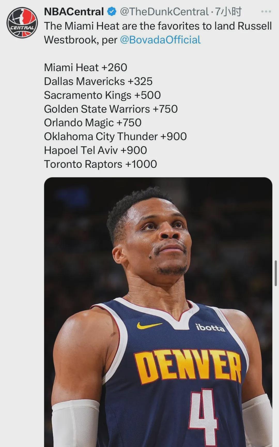 美媒NBA Central近日晒出了威少新下家赔率,热火高居榜首,独行侠紧随其后,国王位列第三,勇士和雷霆均榜上有名。